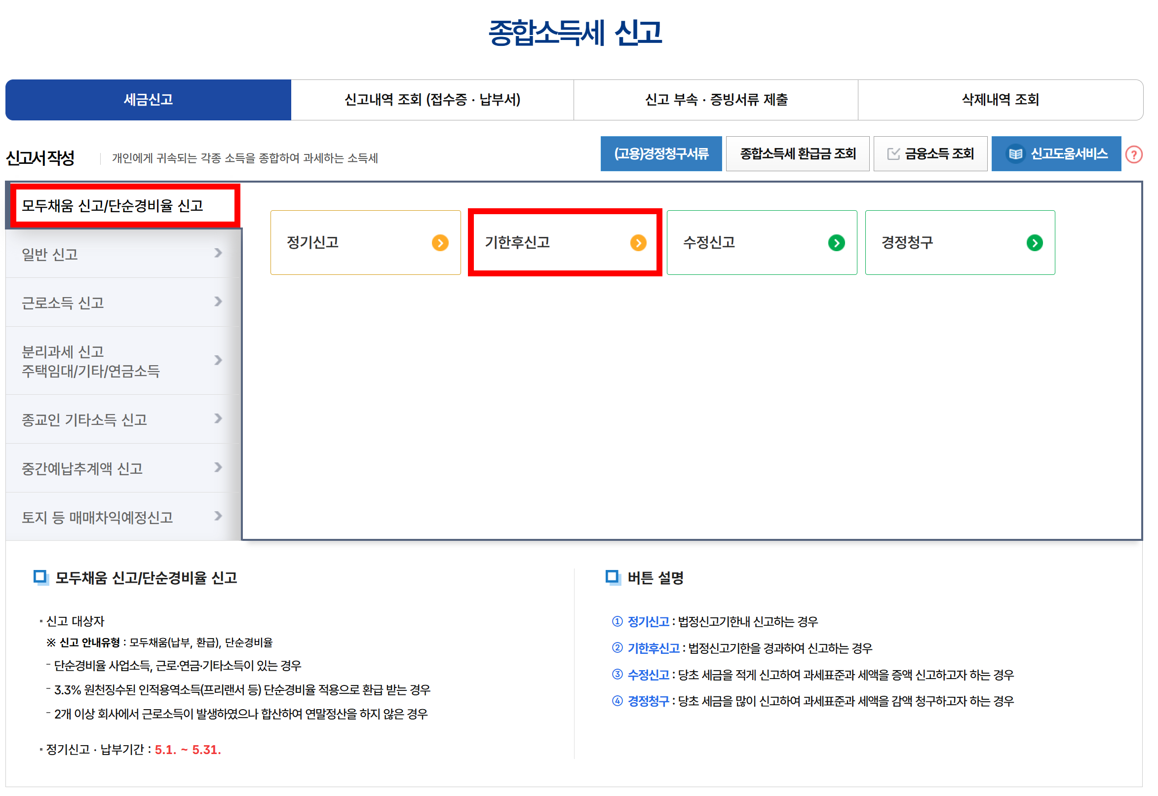 - ‘모두채움 신고’ 또는 **‘단순경비율 신고’**를 선택하여 환급금을 조회합니다.