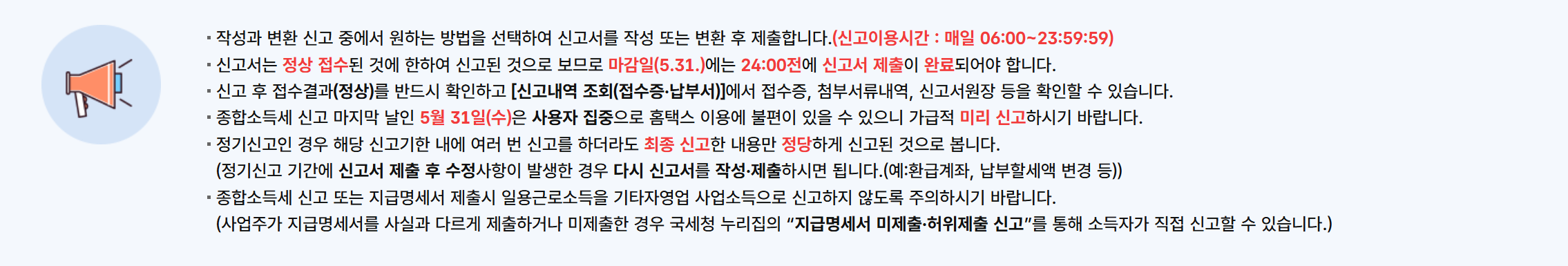 - 홈택스 웹사이트 로그인 후 ‘세금신고’ → ‘종합소득세 신고’ 메뉴로 이동합니다.
