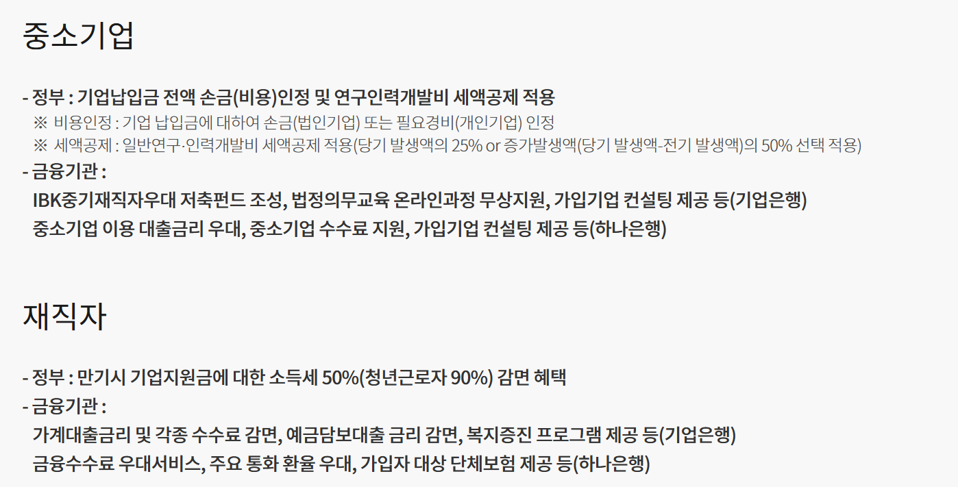 - 기업 지원금: 재직자가 월 최대 50만 원을 저축하면, 기업에서 납입액의 20%인 10만 원을 추가 지원합니다.