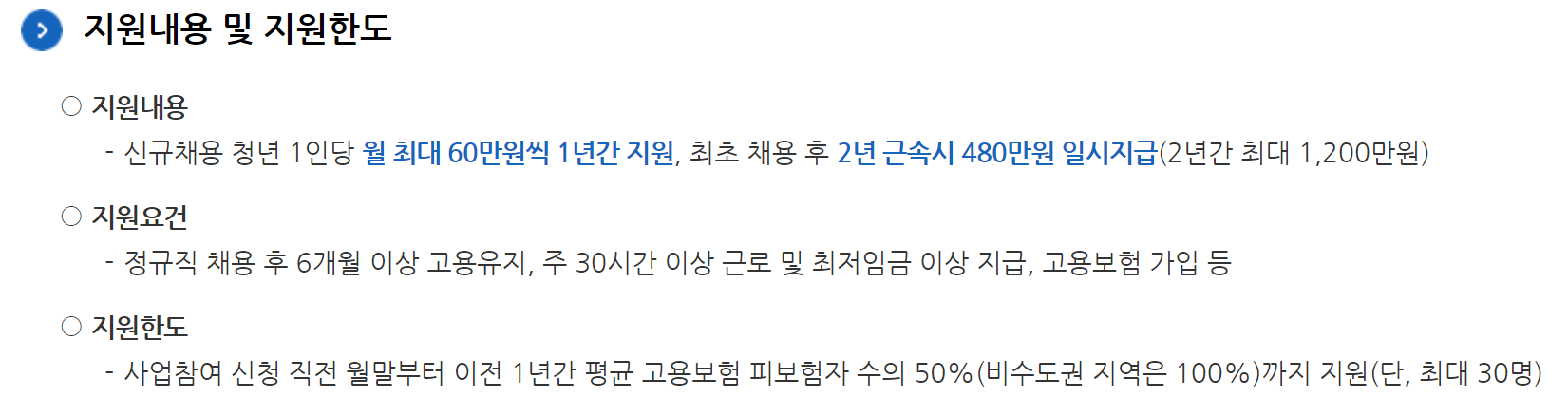 - 청년일자리도약장려금 지원대상 청년이 2년간 근속했을 경우 480만원 장기고용인센티브로 일시 지급 지원