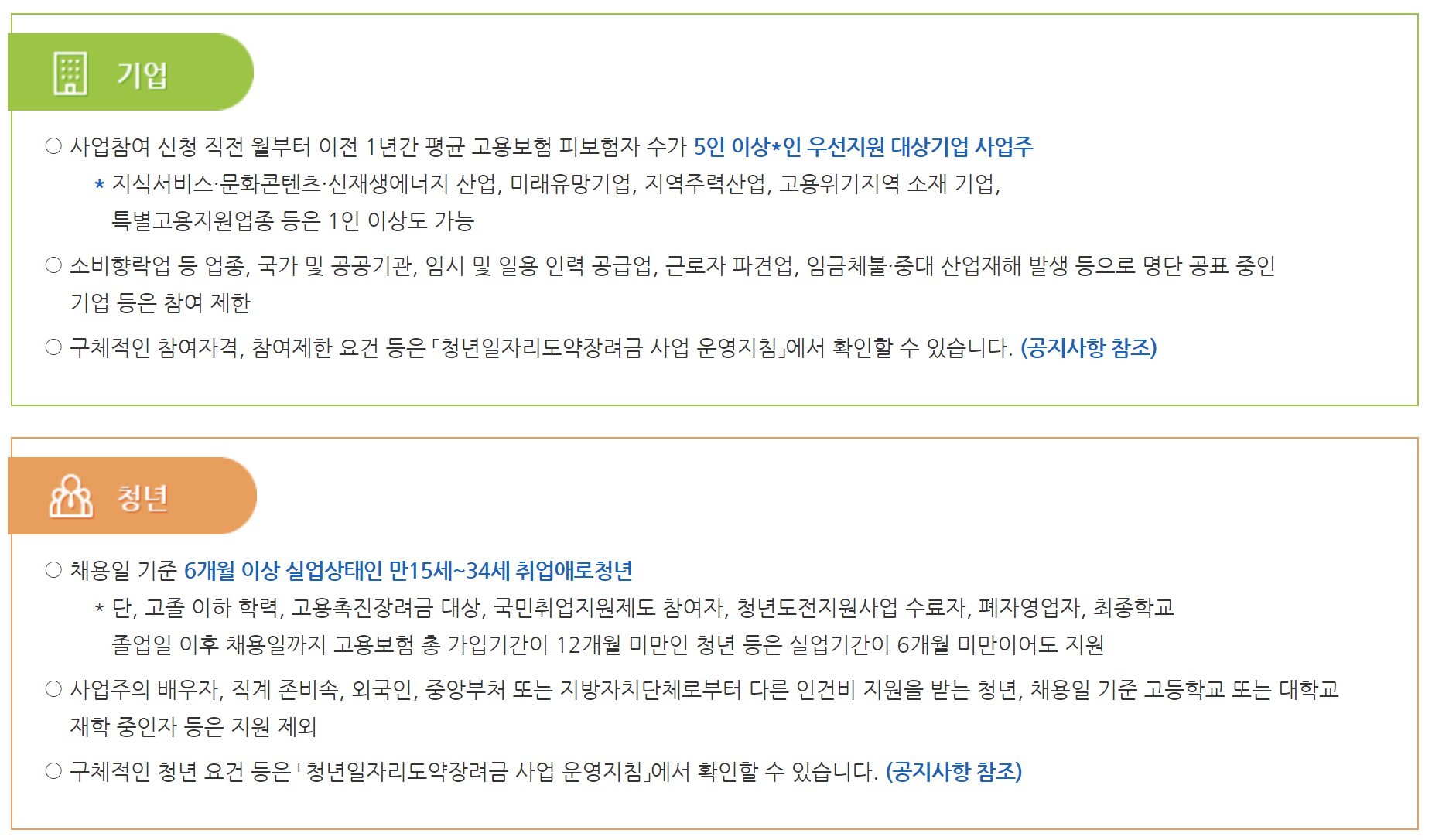 - 청년일자리도약장려금 사업 참여 신청 직전 월부터 이전 1년간 평균 고용보험 피보험자수가 5인 이상을 고영하고 있는 우선지원대상기업 사업주