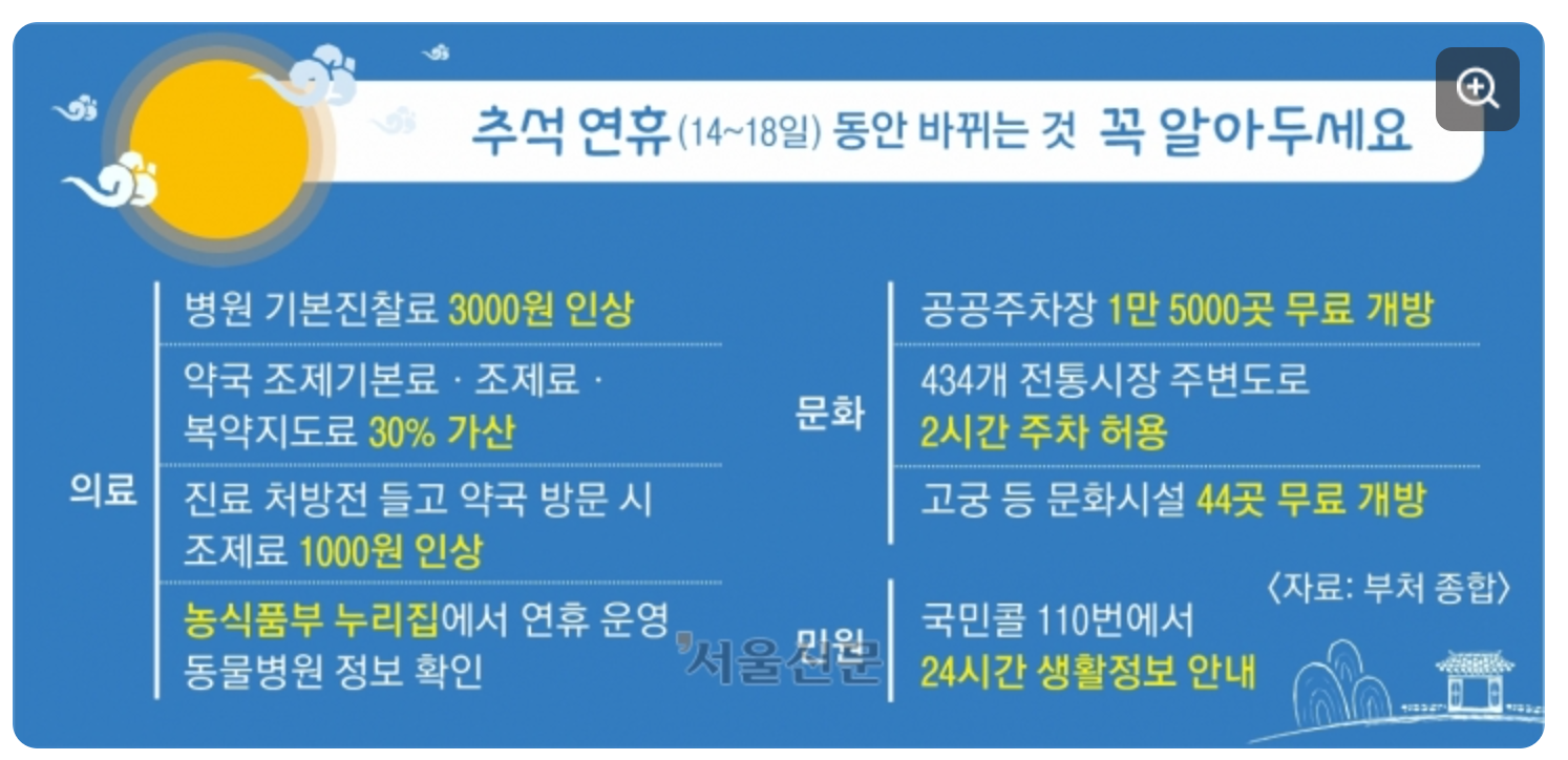 2024년 추석 연휴는 9월 14일부터 18일까지로, 이 기간 동안 공휴일 및 야간 진료가 적용되어 30%~50% 추가 비용이 발생할 수 있습니다. 추석과 같은 연휴 기간에는 야간 및 토요일, 공휴일 진료 가산제도가 적용되며 이는 주로 진찰료, 처치료, 마취료 등의 항목에서 추가 요금이 부과되는 것입니다. 병원과 약국뿐만 아니라 동네 의원에서도 같은 규정이 적용되어 환자들이 예상보다 많은 비용을 부담해야 할 수 있습니다.