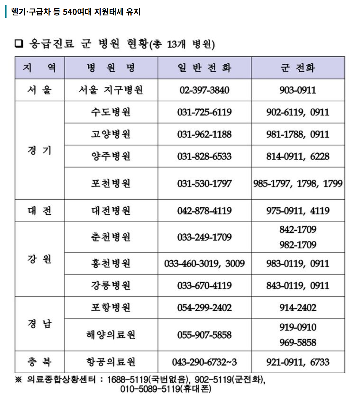 - 구급상황관리센터 : 국번 없이 119