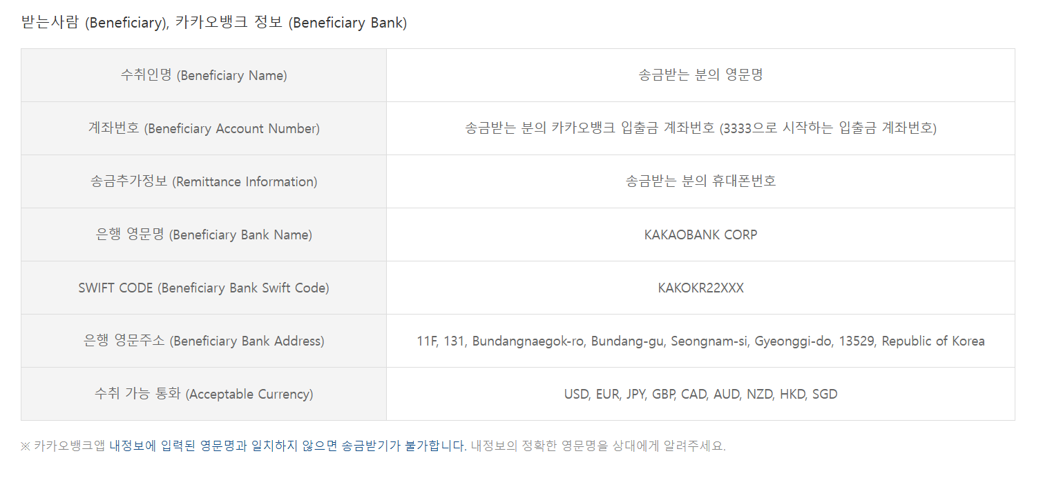- Step 2: 카카오뱅크 앱의 해외송금받기 메뉴에서 송금 정보를 입력합니다.