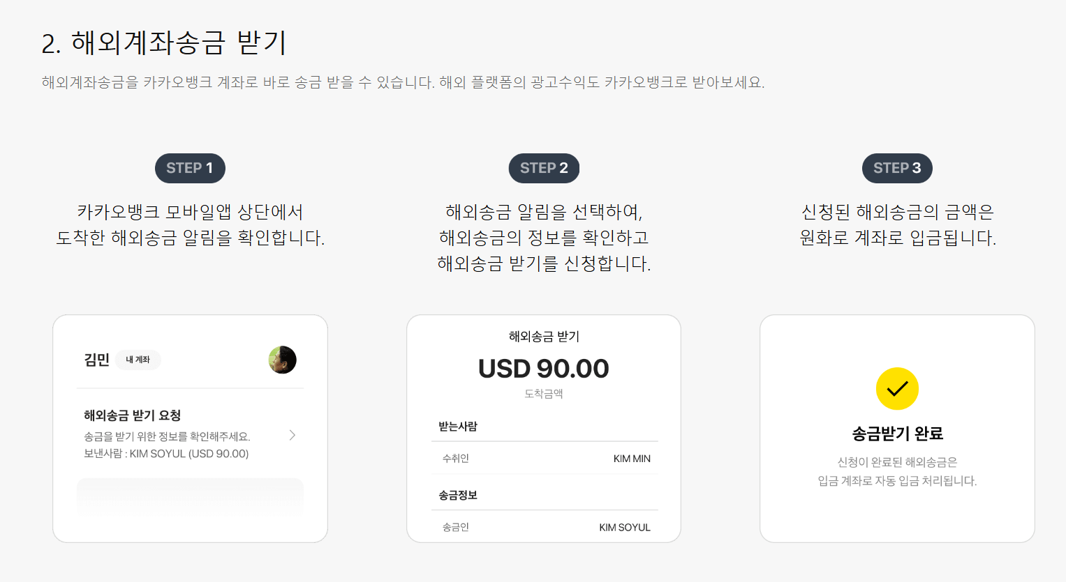 해외계좌에서 바로 카카오뱅크 계좌로 외화를 받을 수 있는 서비스입니다. 해외 광고 수익 등 다양한 플랫폼 수익도 카카오뱅크 계좌로 직접 송금받을 수 있습니다.