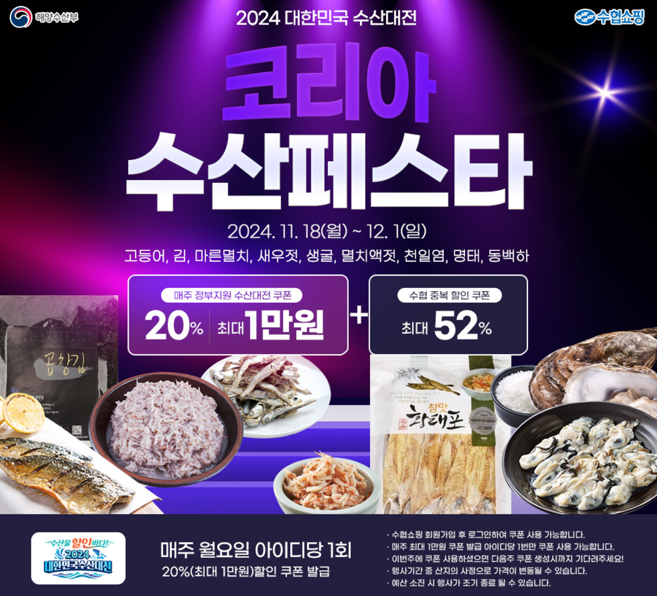 행사 기간 동안 국산 수산물과 김장 재료를 최대 50% 할인된 가격에 구매할 수 있습니다.