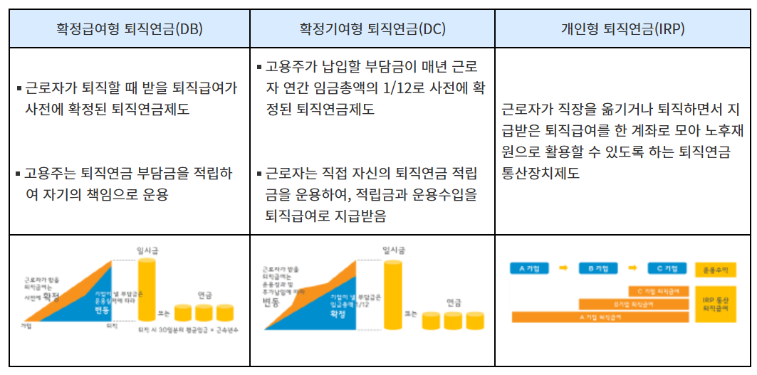 퇴직연금 제도는 크게 확정급여형(DB형), 확정기여형(DC형), **개인형퇴직연금(IRP)**로 나눠집니다. 각 제도의 차이점과 특징을 알아보겠습니다.