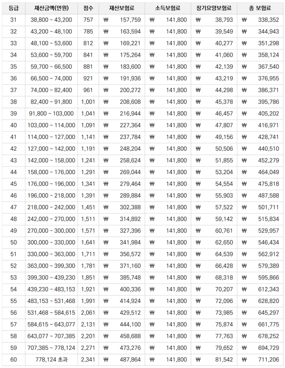 지역가입자의 건강보험료는 소득과 재산에 따라 차이가 크며, 경우에 따라 30만 원~70만 원 이상 나올 수도 있습니다. 다행히 건보료 상한선은 450만 원으로 정해져 있어, 아무리 많이 벌어도 이 금액을 넘지는 않습니다.