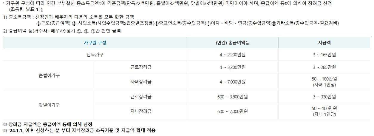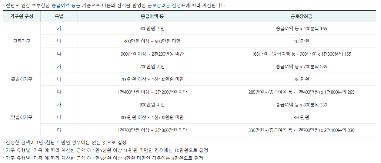 근로장려금 금액은 부부의 총급여액 등을 합산한 금액을 기준으로 합니다.