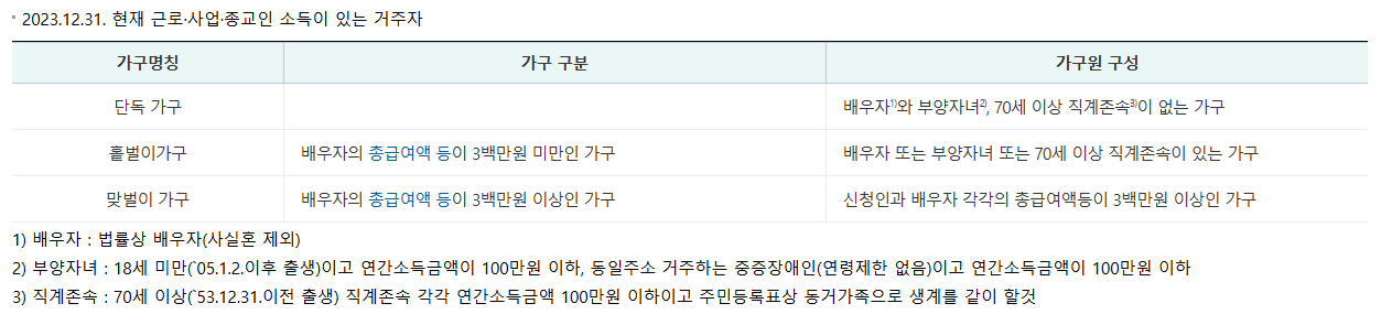 - 홑벌이 가구 : 배우자의 총 급여액이 300만원 미만이거나 부양자녀 또는 부양부모가 있는 경우