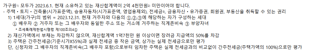 - 전년도 6월 1일 기준 주택, 토지, 건물, 전세보증금, 예금 등 가구원 전원이 보유한 재산 합계액이 2억4천만원 미만의 경우