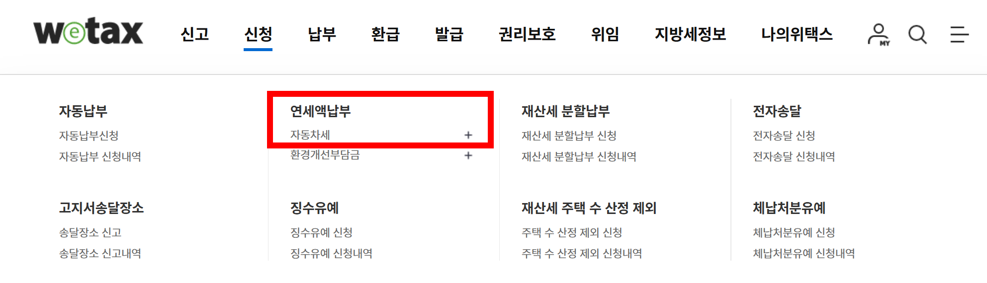 - 메뉴에서 자동차세 > 연세액납부신청 선택