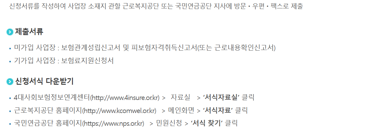 - 근로복지공단 또는 국민연금공단 지사 방문 제출 (우편 및 팩스 제출 가능)