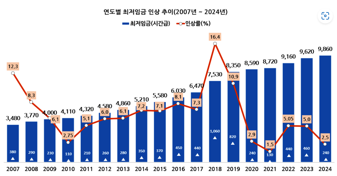 2025년도 최저임금, 최저시급이 2024년도 최저임금 9,860원 최저시급보다 1.7% 인상된 10,030원으로 결정되었습니다.