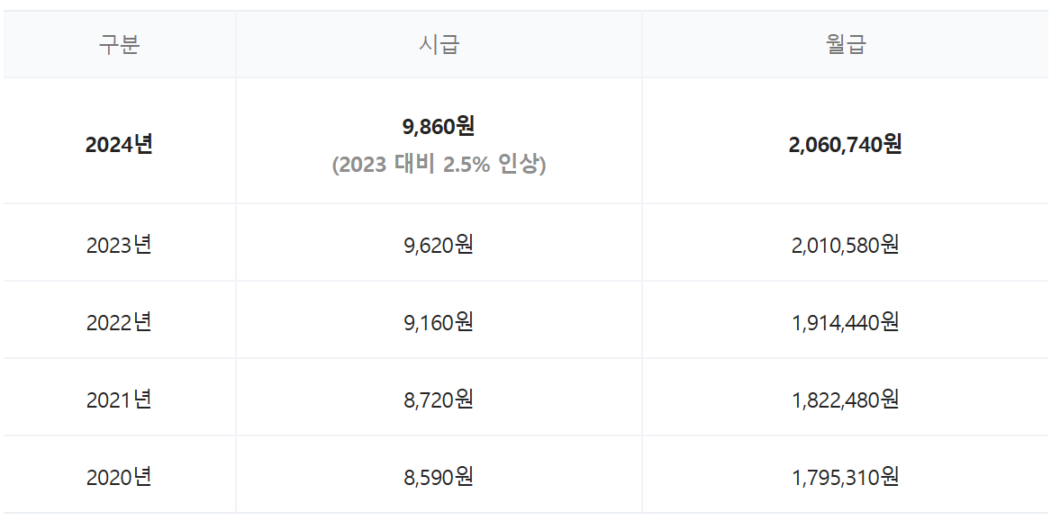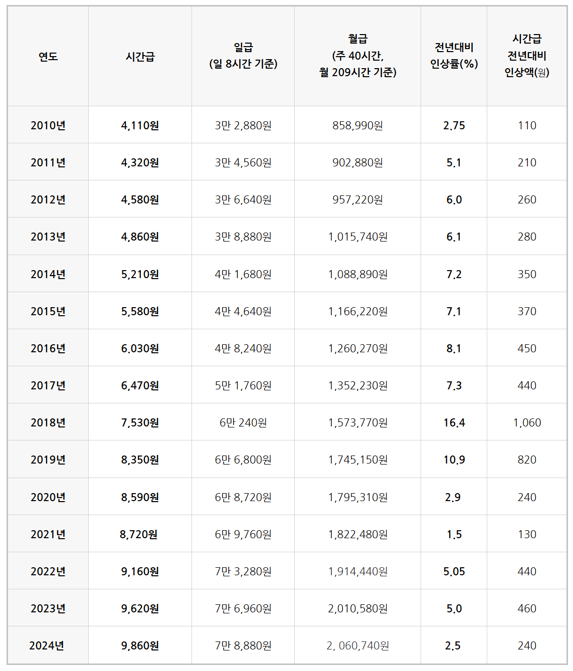 2025 최저임금 최저시급 1.7% 인상 결정되면서 최저시급은 10,030원, 일급은 80,240원, 월급은 2,096,270원, 연봉은 최저임금 기준으로 25,155,240원입니다.