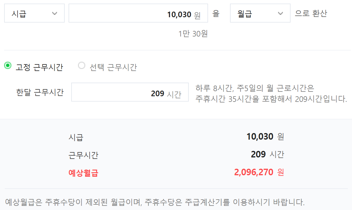 2025 최저시급이 올해보다 1.7% 인상된 10,030원으로 결정되면서 최저임금 월급으로 환산하게 되면 주 40시간, 월 209시간 근무 기준으로 2,096,270원이 됩니다.