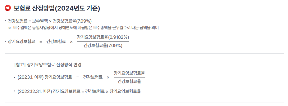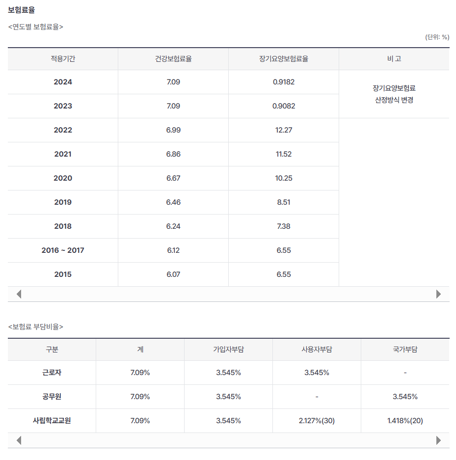 건강보험은 국민 건강을 유지하고 질병 및 부상을 당한 경우 의료비를 지원하여 의료비 부담을 경감시키는 제도입니다. 건강 7.09%, 장기요양 0.9182% 요율로 적용되며 사업자와 근로자가 각각 반반씩 납부하게 됩니다.