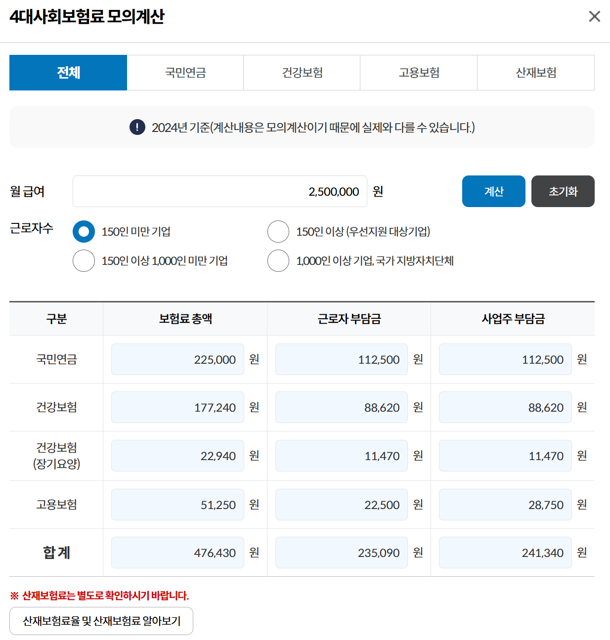 세금을 공제하기 전 월 급여가 250만원일 경우 근로자가 부담하는 4대보험료는
