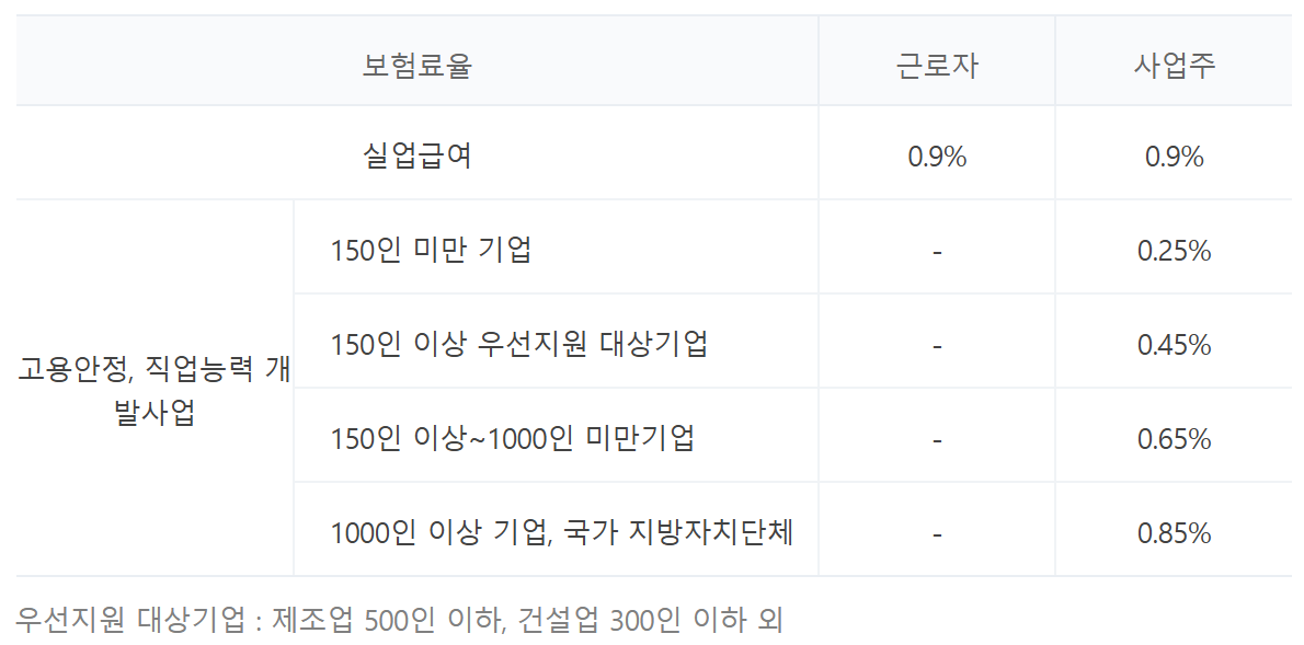 고용보험은 근로자가 퇴직하거나 실업을 당했을 경우 실업급여를 지급하여 근로자의 생활안정과 소득을 보전하고 근로자의 직업능력개발의 향상을 통해 재취업을 돕기 위한 제도입니다. 근로자의 경우 0.9% 부담, 사업자의 경우 근로자 수에 따라 추가로 부담하는 금액이 늘어나게 됩니다.
