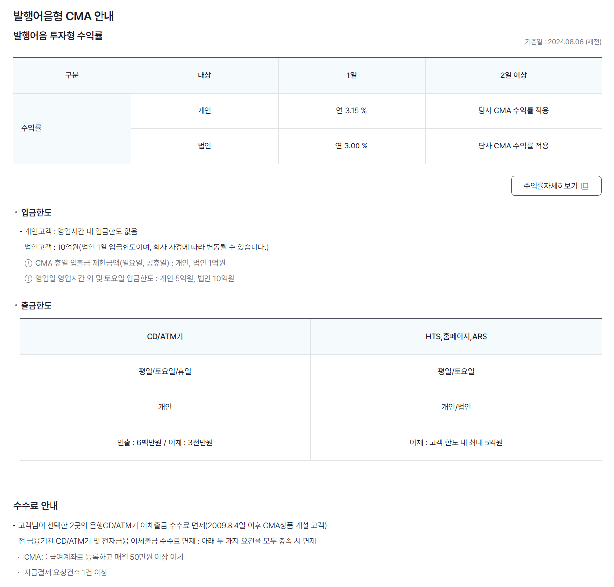 - CMA는 일반 계좌에 비해 이체수수료가 높은 편이다 (일부 증권사에서는 일정 조건을 충족하면 수수료 면제 가능)