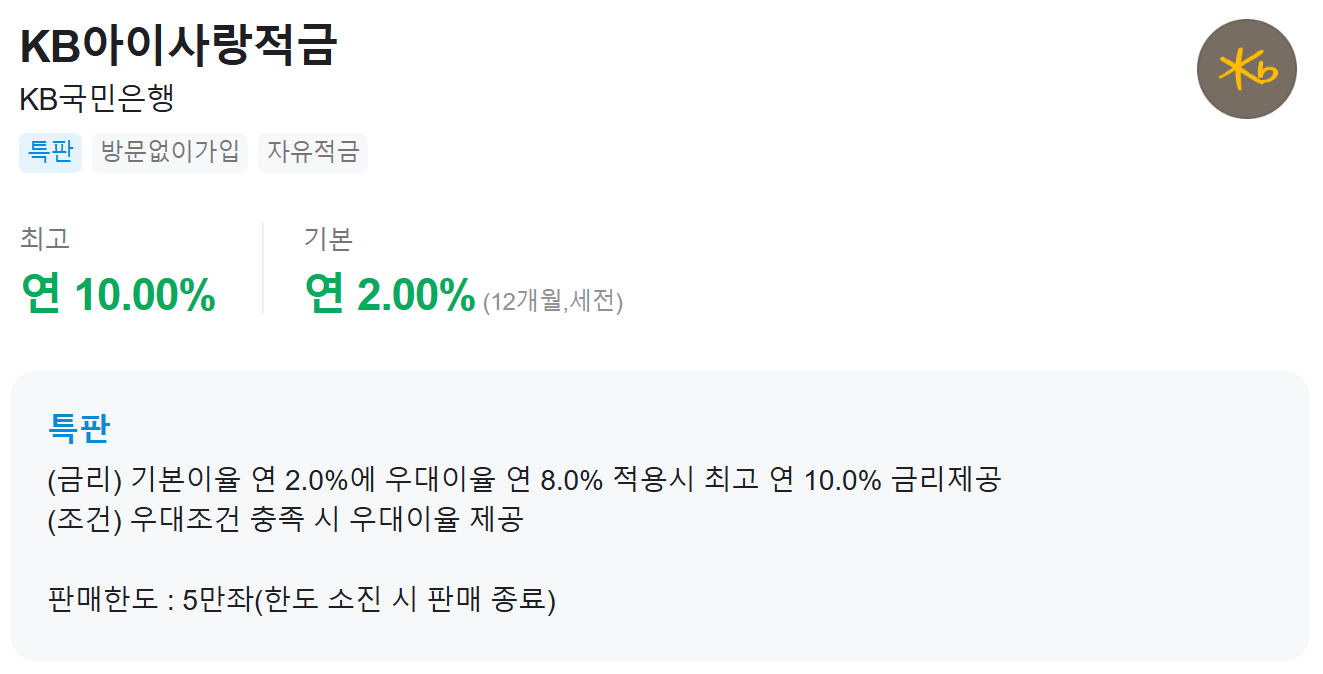 - KB국민은행 KB아이사랑적금은 5만 계좌 판매 한도 소진 시 별도 안내 없이 판매 종료