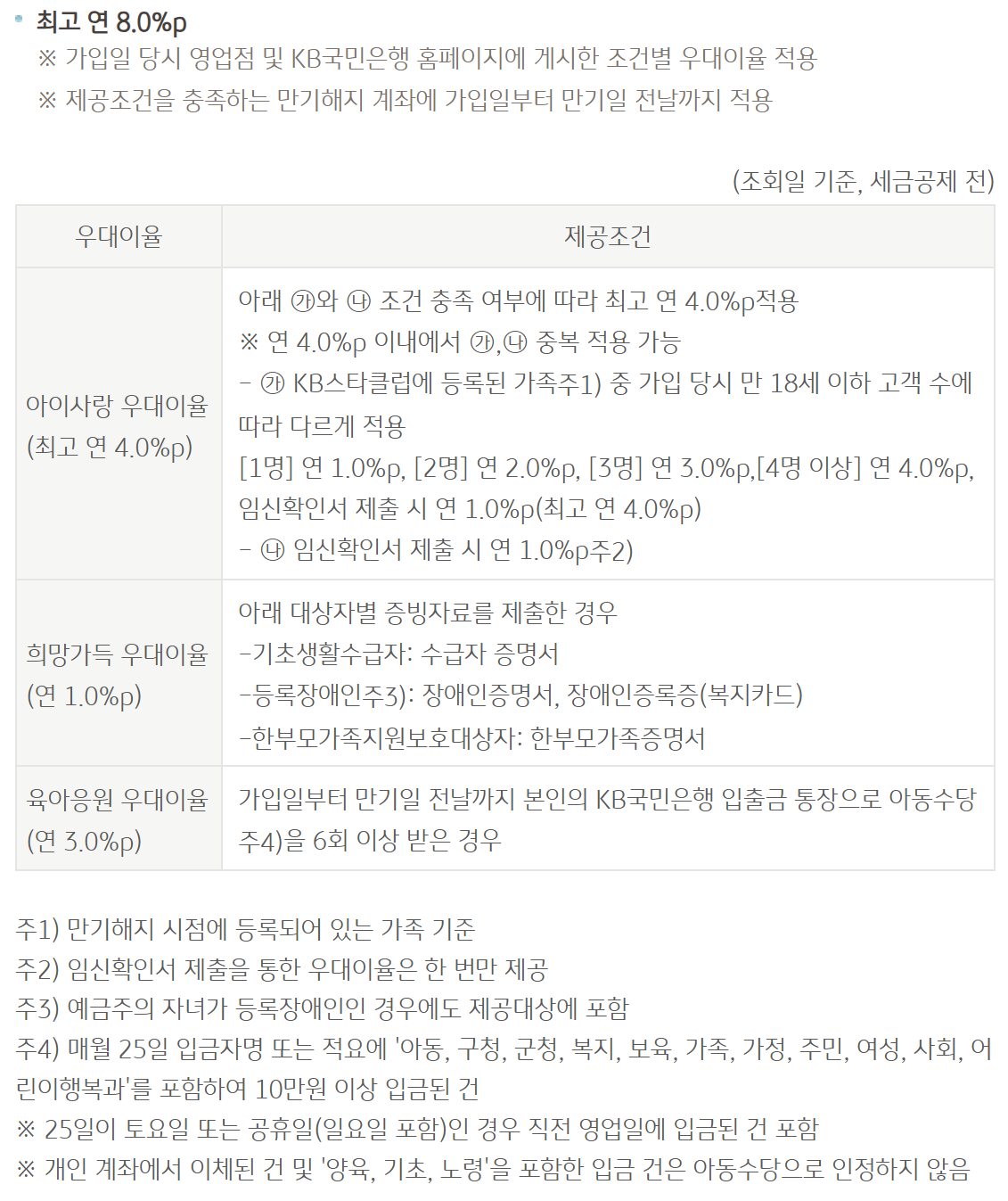 - 육아응원 우대이율 연 3.0% 적용 (가입일로부터 만기일 전날까지 KB국민은행 입출금 통장을 통해 아동수당을 6회 이상 수급)